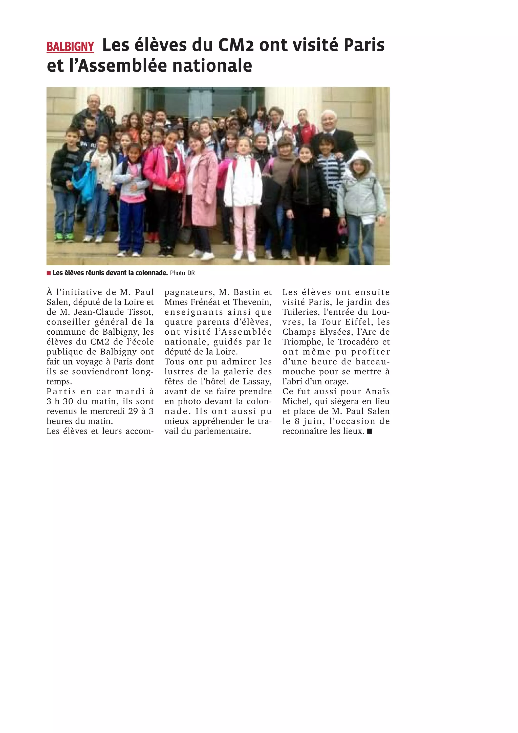 Mardi soir, les équipes locales de basket loisirs se sont affrontées pour un match retour, tandis qu'un voyage à Paris a été réalisé par des élèves de CM2 de Balbigny, leur permettant de visiter des lieux emblématiques et l'Assemblée nationale. Les élèves ont été accompagnés de leurs enseignants et de quelques parents, et cette sortie a également été l'occasion pour Anaïs Michel de se familiariser avec les lieux avant de remplacer Paul Salen. De plus, une journée sur le thème de la motricité a été organisée par la maison de retraite de Bussières, réunissant divers participants.