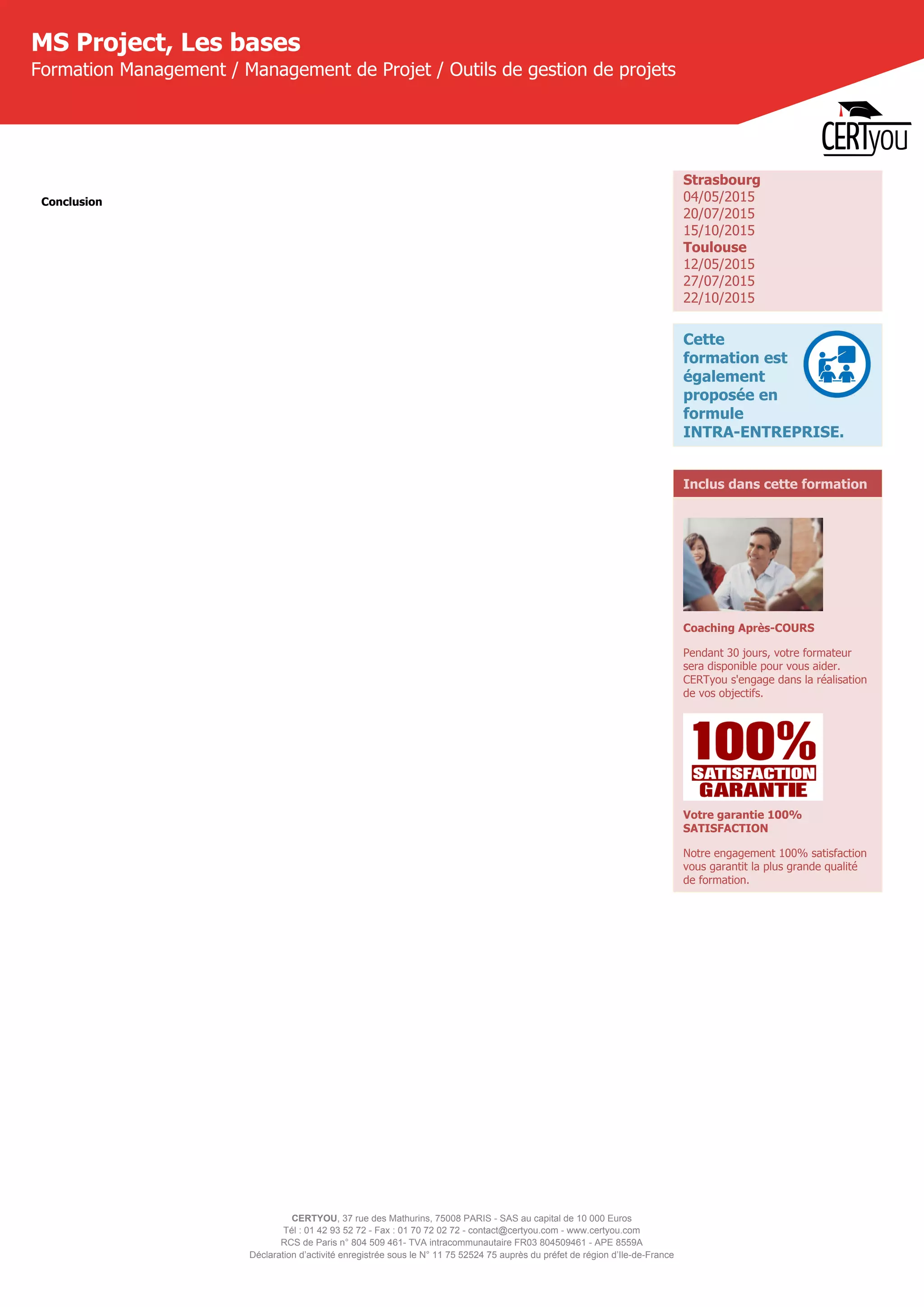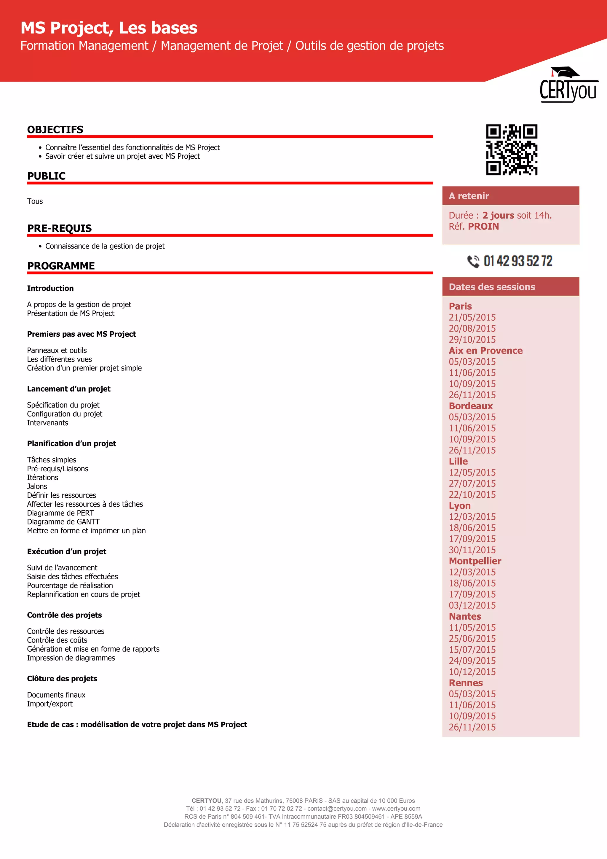 La formation MS Project proposée par Certyou vise à enseigner les fonctionnalités essentielles de gestion de projet. Elle se déroule sur deux jours et inclut des sessions dans plusieurs villes françaises, avec un suivi personnalisé après la formation. Certyou garantit une satisfaction totale à ses participants avec un engagement de qualité pour le contenu pédagogique.
