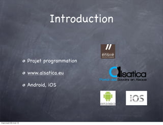 Le projet Alsatica, encadré par François Schnell, vise à développer une application mobile pour Android et iOS en utilisant des outils comme PhoneGap et jQuery Mobile. Le projet a rencontré divers défis, notamment en matière de performances et d'optimisation des services web. Le bilan souligne l'apprentissage de nouvelles technologies et la valorisation de l'image du projet.