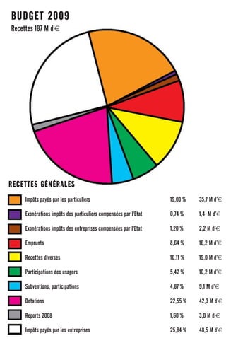Le budget 2010 présente un équilibre délicat avec des recettes et des dépenses atteignant 193,9 millions d'euros, mais subit une baisse des compensations de l'État et une augmentation des dépenses courantes. Malgré les préoccupations causées par les réformes gouvernementales affectant les finances locales, le budget se concentre sur le maintien des services et des investissements nécessaires pour répondre aux besoins de la population. Des projets de construction et de rénovation d'infrastructures sont également prévus pour améliorer le cadre de vie des habitants.