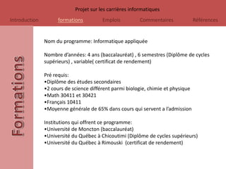 Ce document présente un projet sur les carrières informatiques, détaillant divers programmes de formation, salaires et descriptions d'emplois tels que formateur en informatique, développeur de jeux vidéo, analyste de systèmes de gestion, et concepteur de sites web. Diverses institutions offrant ces formations sont mentionnées ainsi que les pré requis nécessaires. L'auteur exprime son opinion personnelle sur l'intérêt pour certaines carrières, indiquant celles qui l'attirent et celles qui ne l'intéressent pas.