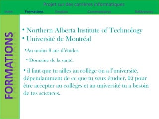 Le document présente un projet sur les carrières informatiques, abordant différentes professions telles que technicien en imagerie médicale, développeur web, réceptionniste, contrôleur de la circulation aérienne et enseignant en informatique. Chaque section détaille les exigences de formation, les salaires et les raisons pour lesquelles l'auteur n'est pas intéressé par certaines carrières. Les références et les ressources pour explorer ces carrières sont également fournies.