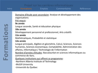 Le document présente un projet sur les carrières informatiques, détaillant les formations, tâches et salaires pour plusieurs métiers tels que l'analyste des systèmes de gestion, l'ingénieur informaticien, le programmeur informatique et l'assembleur en électronique. Chaque section inclut des pré-requis, des institutions proposant les formations, ainsi qu'une auto-évaluation de l'intérêt du présentateur pour ces carrières. En général, le présentateur exprime un manque d'intérêt pour ces différentes professions en informatique.