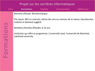 Le document présente un projet sur les carrières informatiques, détaillant cinq domaines d'étude, les prérequis, les durées de formation et les salaires potentiels. Chaque domaine est accompagné de commentaires sur l'intérêt personnel de l'auteur vis-à-vis des carrières mentionnées. Les domaines incluent la bioinformatique, le développement de jeux vidéo, la conception de pages web, le réseautage de systèmes informatiques et l'informatique générale.