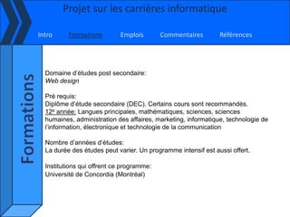 Le document présente divers parcours professionnels en informatique, incluant le web design, le modélisme, la géomatique, le montage de lignes, et la bioinformatique. Pour chaque domaine, il expose les exigences académiques, les institutions offrant des formations, les salaires potentiels, et les intérêts personnels de Jesse Duguay à l'égard de ces carrières. Des références sont fournies pour compléter les informations sur chaque profession mentionnée.
