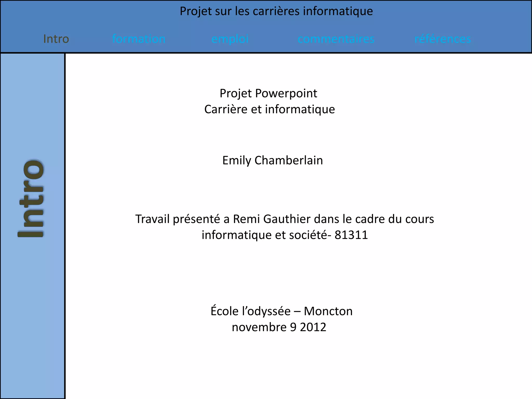 Le document présente un projet sur les carrières en informatique, explorant divers emplois tels qu'ingénieur en matériel informatique, production et animation 3D, et technicien en génie électrique. Pour chaque emploi, il décrit les pré-requis, les institutions offrant les programmes, la durée des études, ainsi que la variation des salaires. L'auteur exprime son manque d'intérêt pour ces carrières tout au long du projet.