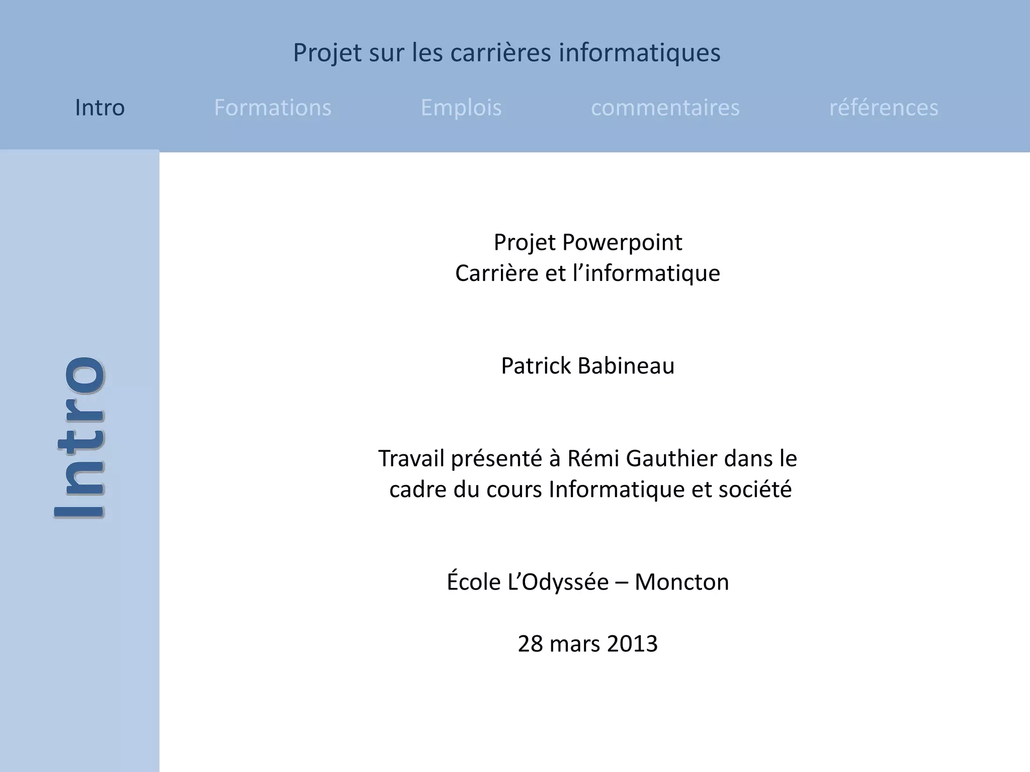 Le document présente différents métiers liés aux carrières informatiques, dont les conditions d'admission, les salaires, et les descriptions de travail pour les postes tels que spécialiste en soutien informatique, développeur de jeux vidéo, et concepteur graphique. L'auteur exprime un manque d'intérêt pour ces métiers en raison d'une faible compétence technique et d'une aversion à travailler devant des écrans. Des références à des programmes d'études offerts par l'Université de Moncton et le Collège Communautaire du Nouveau-Brunswick sont également incluses.