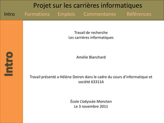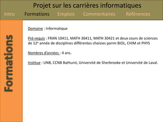 Le document présente un projet sur les carrières informatiques, détaillant divers métiers tels que programmeur, ingénieur informaticien, formateur en informatique, spécialiste de la bioinformatique et spécialiste en soutien informatique, avec les prérequis de formation et les salaires associés. L'auteur exprime ses intérêts personnels concernant chaque carrière, indiquant une préférence pour la bioinformatique en raison de son intérêt pour la biologie. Des références concernant les cours et des informations supplémentaires sur les carrières sont également incluses.