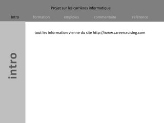 Le document présente divers métiers liés à l'informatique, notamment le rôle de webmestre, préposé au traitement de films, commis à l'expédition et à la réception, commis à la saisie de données et technicien en génie civil, avec des détails sur les qualifications nécessaires et les salaires. Chaque profession a des exigences d'éducation et d'expérience différentes ainsi que des avantages et inconvénients perçus par l'auteur. L'auteur exprime une réticence à poursuivre certains de ces métiers en raison des longs horaires de travail assis et de la répétition des tâches.