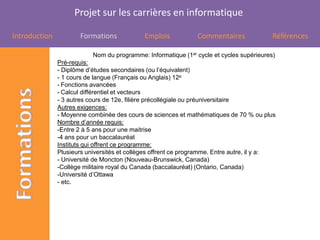 Le document présente un projet sur les carrières en informatique, détaillant les formations, les prérequis et les salaires associés à plusieurs métiers du secteur, tels qu'analyste de systèmes, développeur web et formateur en informatique. Il souligne que de nombreux instituts offrent des programmes de formation adaptés, tout en précisant que l'auteur exprime son désintérêt pour chacune des carrières mentionnées. Des références à des sources externes concernant les carrières et l'éducation en informatique sont également incluses.