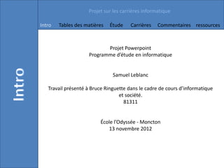 Le document présente un projet sur les carrières en informatique, abordant divers programmes d'études et les emplois associés, tels que technicien en architecture, programmeur en médias interactifs et développeur de logiciels 3D. Chaque carrière est décrite avec ses responsabilités et les salaires correspondants. L'auteur exprime son manque d'intérêt pour ces métiers, préférant des emplois plus dynamiques qui nécessitent de voyager.