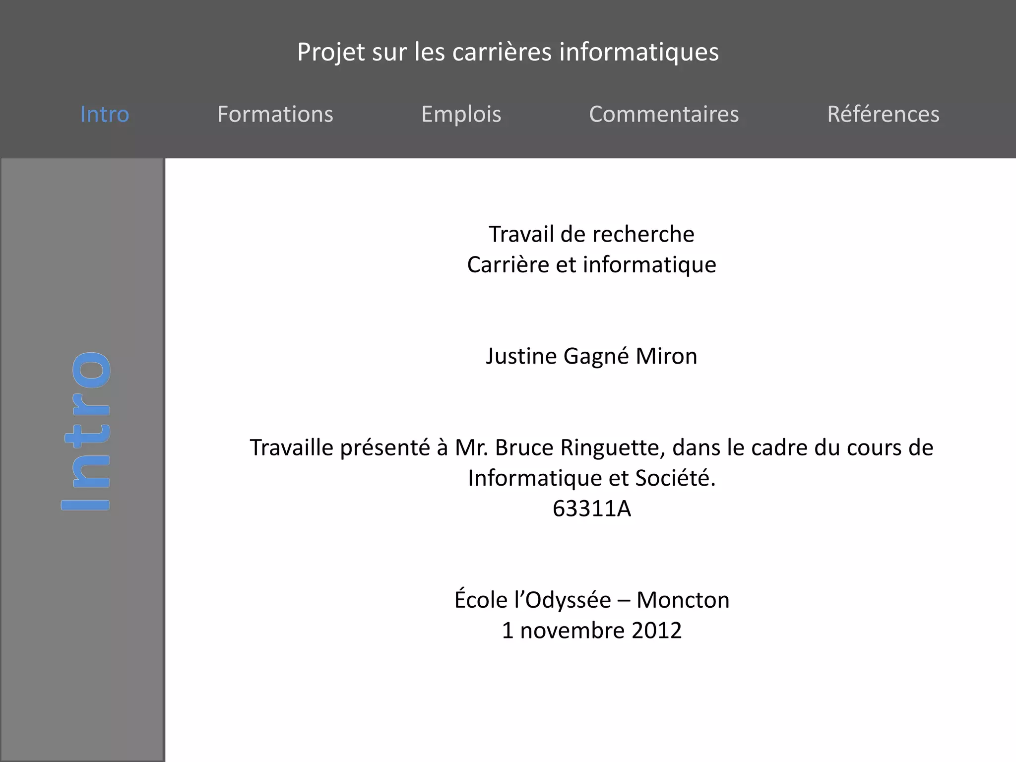 Le document présente un projet sur les carrières informatiques, explorant divers postes tels que programmeur, gestionnaire de projets et web designer, ainsi que les salaires associés à chaque profession. Justine Miron exprime son désintérêt pour ces carrières, soulignant qu'elles ne correspondent pas à ses intérêts en sciences. Des références à des ressources en ligne sur ces métiers sont également incluses.