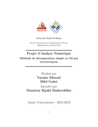 Le document présente un projet d'analyse numérique réalisé à l'École Nationale d'Ingénieurs de Tunis, portant sur des méthodes de décomposition simple en 1D, notamment les méthodes de différences finies pour résoudre des équations aux dérivées ordinaires. Il traite des conditions aux limites de Dirichlet et Neumann, de la méthode de Schwarz alternée et parallèle, ainsi que de l'optimisation de la solution à l'aide de MATLAB. Le projet souligne l'importance des conditions aux limites et présente des résultats d'erreurs et d'ordres de convergence.