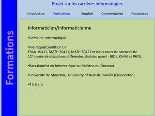 Le document présente un projet sur les carrières informatiques, détaillant des formations et des emplois dans divers domaines tels que l'informatique, le génie civil, la biologie, la psychologie, et la biochimie. Chaque section indique les pré-requis, les niveaux d'études, les universités concernées, ainsi que les salaires potentiels. L'auteur exprime également ses préférences personnelles concernant les carrières abordées.