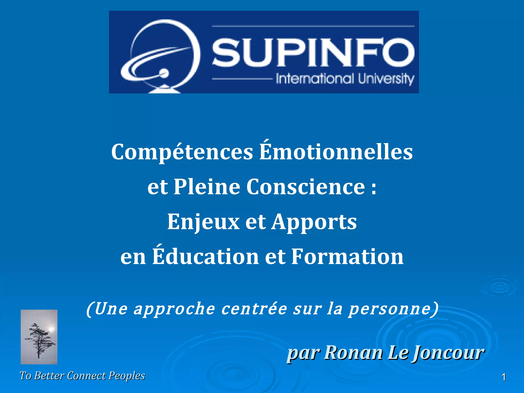 Le document présente des recherches sur l'intégration de la méditation de pleine conscience et des compétences émotionnelles dans l'éducation et la formation. Il aborde les enjeux de ces pratiques en France par rapport à d'autres pays et décrit le protocole MBSR, qui vise à développer des compétences pour mieux gérer le stress et améliorer l'apprentissage. L'auteur, Ronan Le Joncour, souligne le besoin d'études locales pour évaluer ces approches innovantes.