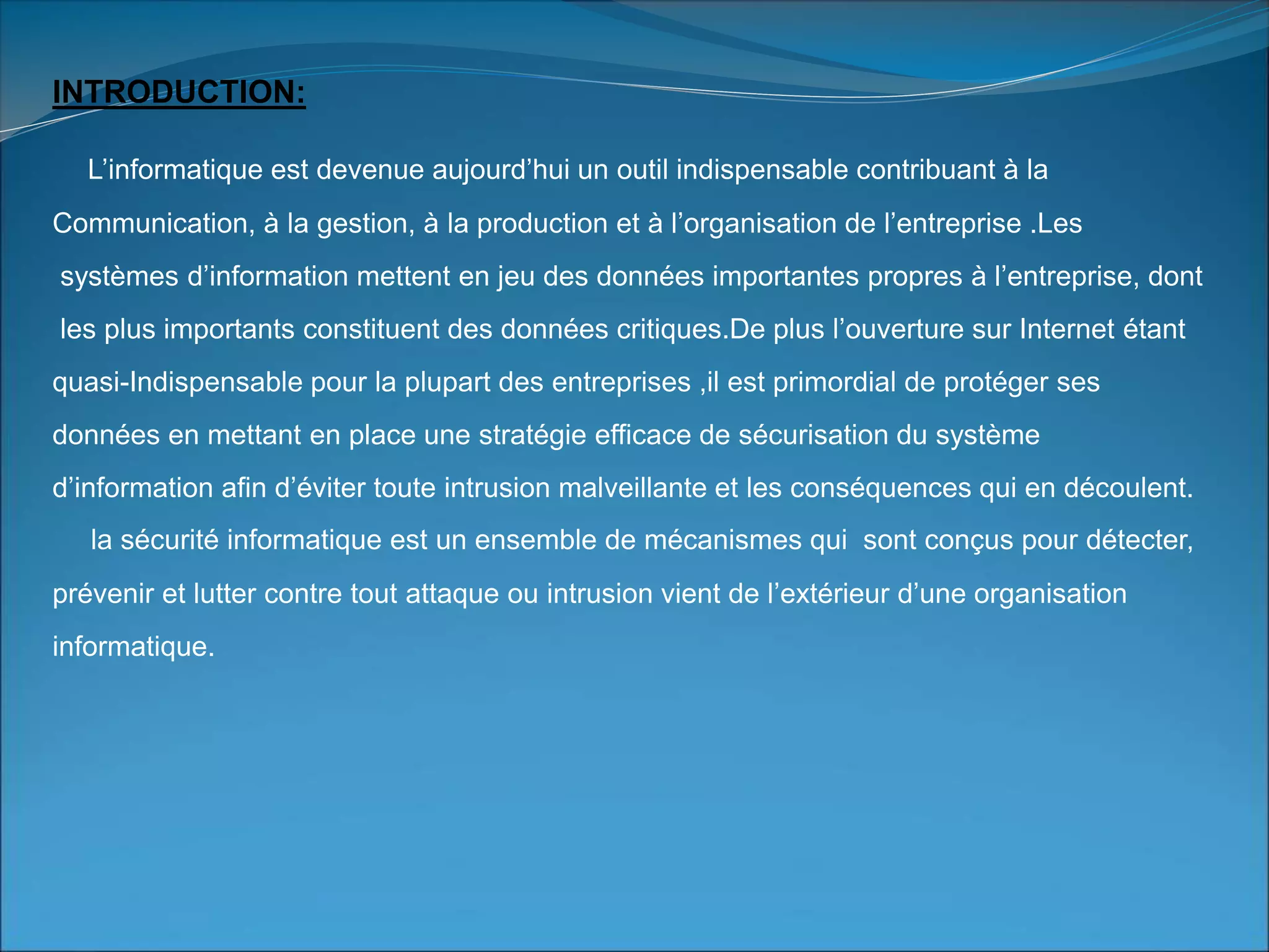 Le document traite de l'importance de la sécurité informatique dans les entreprises, en abordant les menaces potentielles telles que le piratage, les virus et les attaques par déni de service. Il souligne la nécessité d'une stratégie de sécurité efficace, incluant des mesures basiques et avancées pour protéger les données, assurer leur intégrité, confidentialité et disponibilité. Enfin, il discute des techniques de prévention comme l'utilisation d'antivirus, la formation du personnel, et le contrôle des utilisateurs et des données.