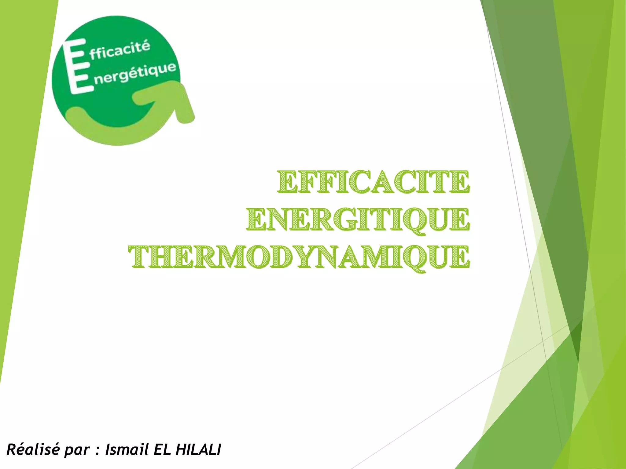 Le document explore l'efficacité énergétique des machines thermiques, en définissant des concepts clés tels que l'efficacité énergétique et les principes de la thermodynamique. Dans les différents chapitres, il présente les classifications des machines thermiques, les moteurs thermiques, les machines frigorifiques et les pompes à chaleur, ainsi que des exemples d'efficacité énergétique dans divers systèmes. En conclusion, il souligne l'importance de comprendre ces notions pour améliorer l'efficacité des systèmes énergétiques.