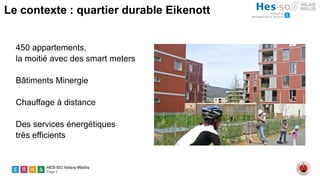 Le document analyse l'éco-quartier d'Eikenott à Gland, en se concentrant sur les services énergétiques et leur relation avec la satisfaction des habitants. Les résultats montrent que la qualité des services énergétiques n'est pas perçue comme créant de la valeur tant qu'aucun problème ne survient, ce qui influence négativement la satisfaction lorsqu'il y a des défaillances. Il est proposé d'impliquer les résidents dans des actions communautaires pour améliorer la perception et l'utilisation des services énergétiques.