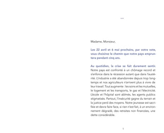 Le document présente les engagements d'un candidat à l'élection présidentielle de 2012 pour redresser la France face à la crise économique, avec des propositions visant à relancer l'emploi, soutenir les PME, et garantir l'accès à des services publics de qualité. Il souligne la nécessité d'une justice sociale et économique renforcée, ainsi que des réformes fiscales pour alléger la pression sur les classes moyennes et soutenir les plus vulnérables. Le candidat appelle également à une mobilisation collective pour assurer la souveraineté française face aux défis contemporains.