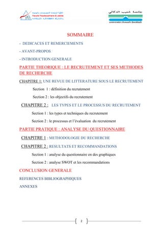 Ce projet de fin d'études se concentre sur la gestion du recrutement au sein des ressources humaines, en analysant les méthodes, types et processus de recrutement. Il comprend une partie théorique sur la définition et les objectifs du recrutement, suivie d'une partie pratique basée sur l'analyse d'un questionnaire et des recommandations. Le travail met en avant l'importance d'un bon processus de recrutement pour garantir le succès d'une organisation.