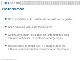 Le projet IBATS au Techno-Pôle, dirigé par l'institut Hesso/Valais, se concentre sur l'optimisation de la consommation d'énergie et la production locale à travers l'utilisation d'un microgrid. Les objectifs incluent la connaissance des paramètres énergétiques, l'intégration d'énergies renouvelables et une meilleure synchronisation entre production et consommation électrique. Les partenaires du projet incluent divers acteurs industriels et académiques, visant à réduire les coûts énergétiques et à améliorer l'efficacité énergétique des bâtiments.