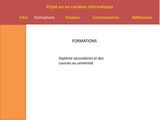 Le document traite des carrières dans le domaine informatique, soulignant les avantages d'être enseignant en technologie, notamment le sentiment d'aider les jeunes à s'informer sur les technologies. Il décrit également les exigences en matière de formation, comme des diplômes secondaires et des cours universitaires, et met en avant la satisfaction que procure la réparation d'ordinateurs. Enfin, il mentionne la flexibilité d'horaire comme un atout de cette profession.