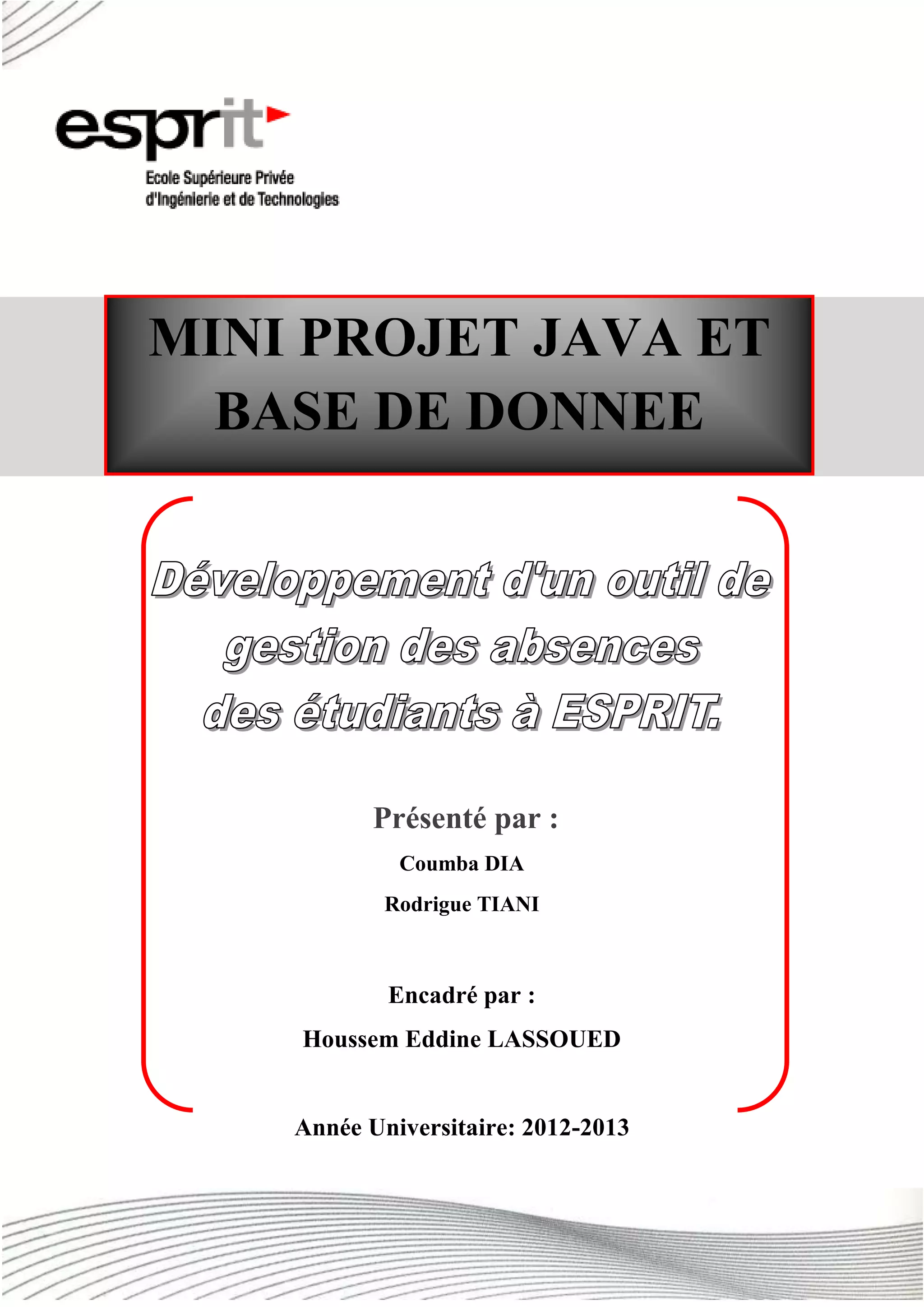 Le document présente un mini-projet de développement d'une application de gestion des absences des étudiants à l'école Esprit, structuré en trois phases : étude et spécification, analyse et conception, et développement, test et validation. Il décrit les besoins fonctionnels, les solutions existantes, et les fonctionnalités clés de l'application telles que la gestion des absences, l'envoi de notifications et la génération de rapports. L'objectif est d'automatiser le processus de suivi des absences pour améliorer l'efficacité de la gestion scolaire.