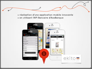 Le document présente un concours organisé par Axa Banque visant à développer une application mobile innovante en utilisant leur API. Les équipes doivent réaliser un prototype en deux jours, intégrer des fonctionnalités telles que la localisation des achats, et partager les résultats avec la communauté agile. Plusieurs idées ont été collectées, incluant des notifications et des fonctionnalités pour gérer les opérations bancaires de manière interactive.