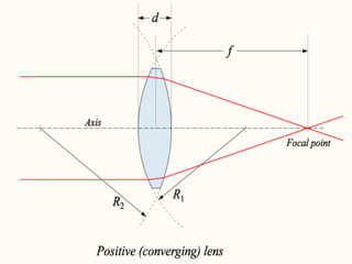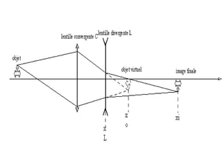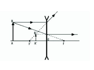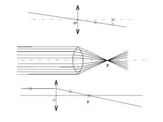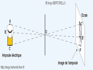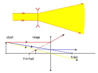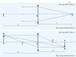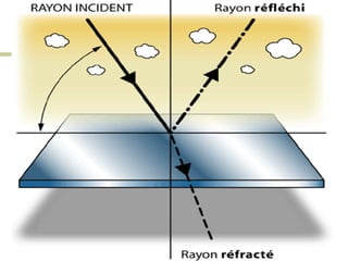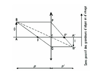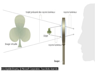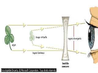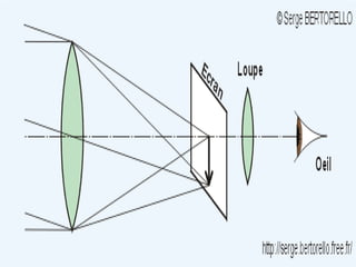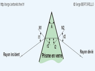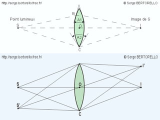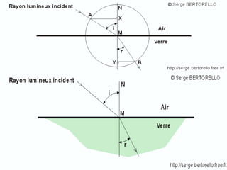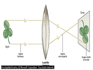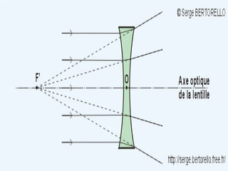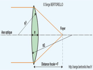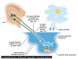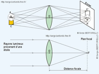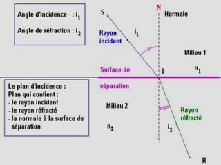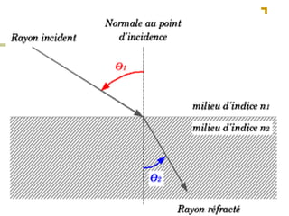 Ce document traite de la diffusion de la lumière, des lois de la réflexion et de la réfraction, ainsi que des caractéristiques des lentilles convergentes et divergentes. Il aborde également l'indice de réfraction et son calcul, ainsi que l'utilisation de lentilles pour corriger divers problèmes de vision tels que la myopie et l'hypermétropie. Les concepts sont soutenus par les lois de Snell-Descartes et les principes de fonctionnement des miroirs et de l'œil.
