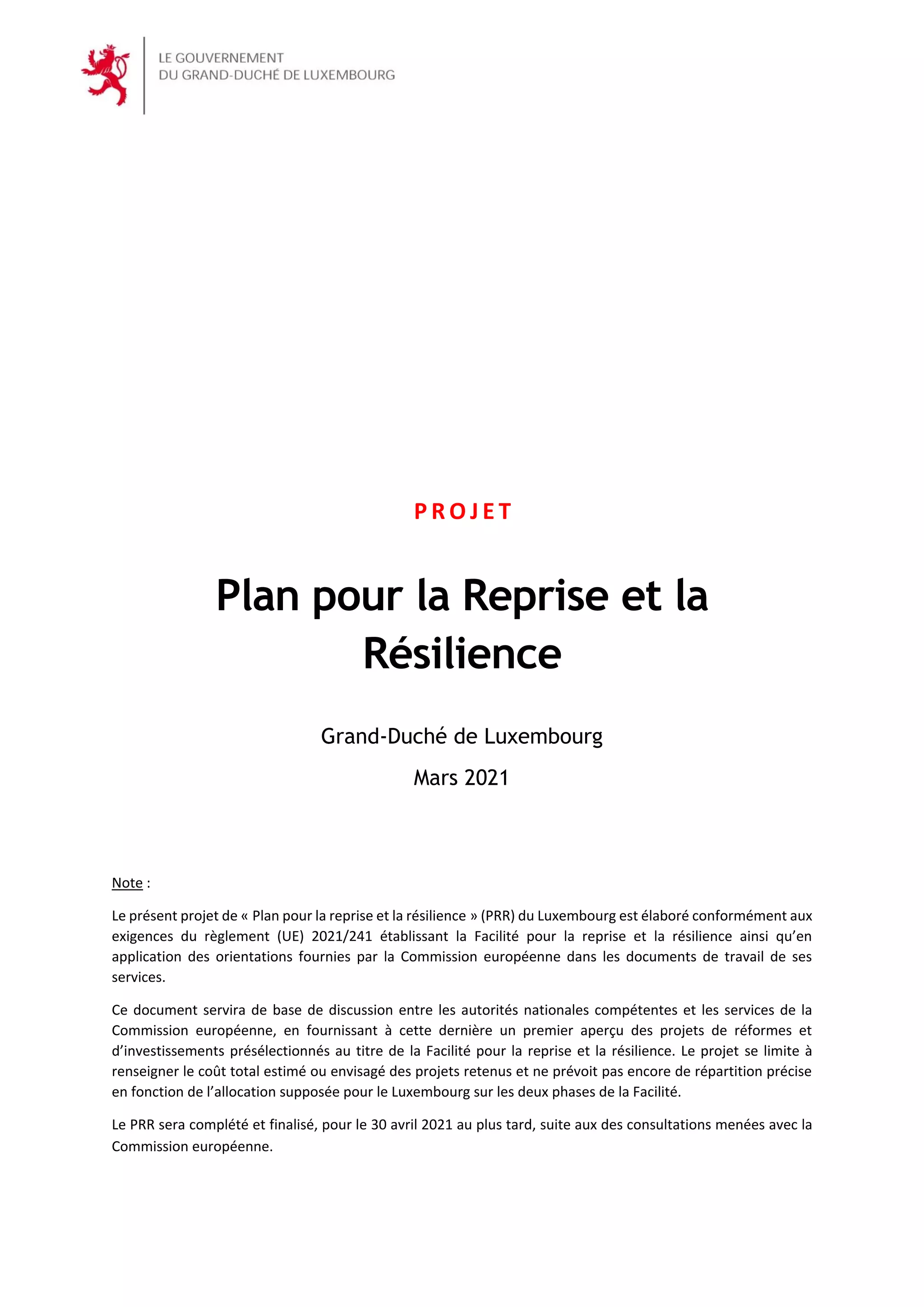 Le plan pour la reprise et la résilience du Luxembourg établit une feuille de route pour reconstruire une économie capable de faire face aux défis d'un monde post-COVID-19, en mettant l'accent sur la cohésion sociale, la transition verte et la digitalisation. Il s'inscrit dans le cadre des orientations de l'Union européenne et prévoit des réformes et des investissements pour favoriser une résilience économique, sociale et environnementale. Ce projet sera complété après consultation avec la Commission européenne et se base sur des fondements budgétaires déjà prévus pour 2021-2024.