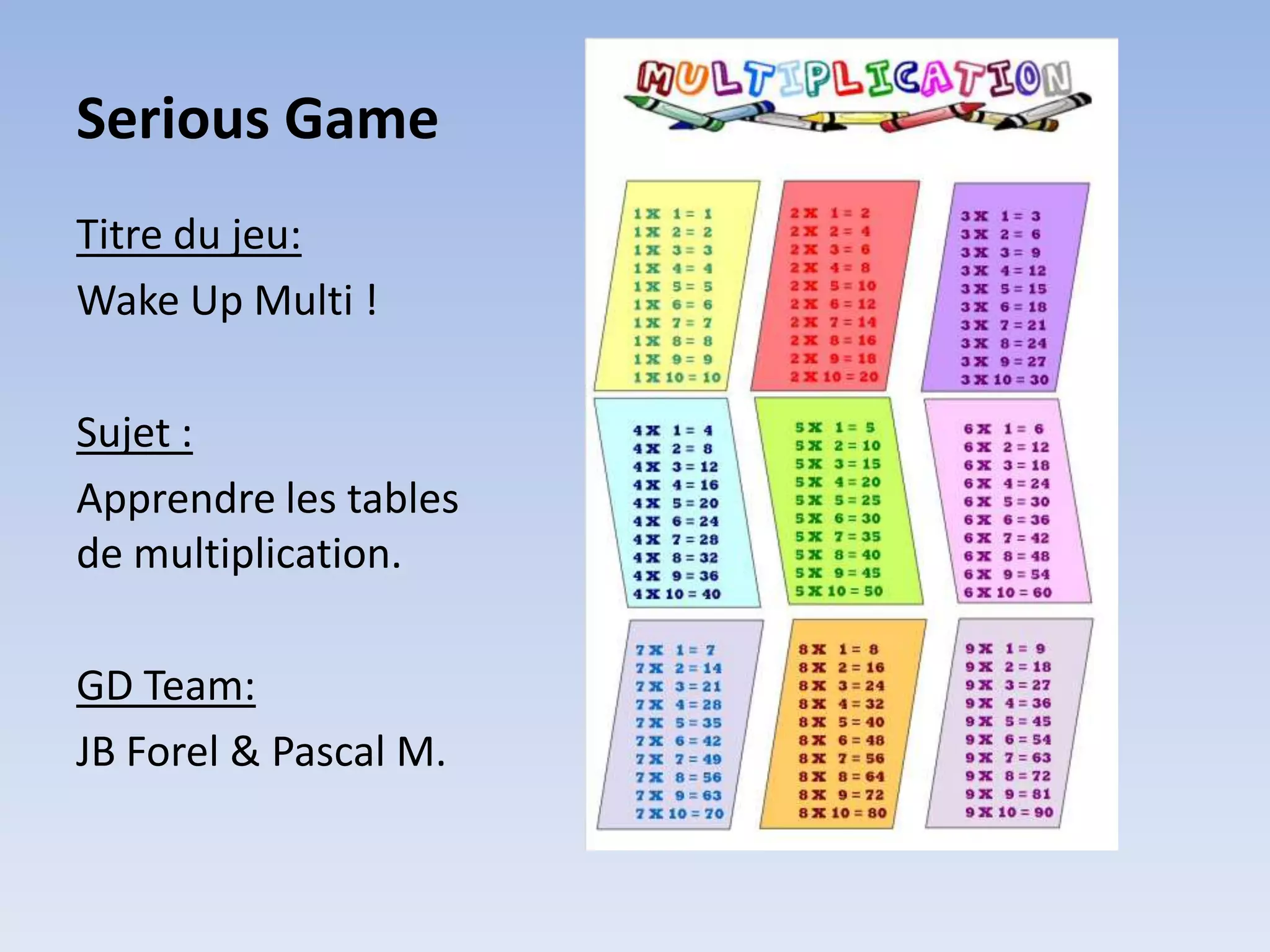 Le document présente 'Wake Up Multi', un jeu éducatif destiné à apprendre les tables de multiplication via un robot virtuel appelé Multi. Le jeu permet aux joueurs, notamment un père et son fils, d'interagir et de répondre à des questions pour garder le robot éveillé, tout en offrant des modes d'apprentissage et de défi. Les progrès des joueurs sont mesurés par des métriques telles que le temps de réaction et le nombre de niveaux complétés.
