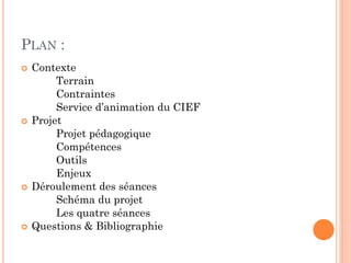 Le projet pédagogique 'On fait un voyage' vise à préparer des étudiants du CIEF à organiser un voyage en France en développant diverses compétences telles que la recherche d'informations et la rédaction de programmes. Le déroulement comprend quatre séances, de la sélection de villes à la présentation finale des programmes devant l'animatrice du CIEF. L'objectif principal est de permettre aux étudiants de participer activement à la recherche de nouvelles destinations tout en découvrant les activités du centre d'animation.
