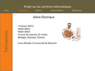 Le document présente un projet sur les carrières informatiques, incluant diverses formations et emplois possibles dans ce secteur, ainsi que les salaires associés. Il décrit des spécialisations comme ingénieur électricien, soutien informatique, et développement de jeux, tout en exprimant un manque d'intérêt personnel pour certaines de ces carrières. Enfin, une bibliographie inclut des références aux ressources consultées pour le projet.