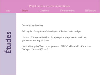 Le document présente un projet sur les carrières informatiques, discutant différents domaines tels que l'animation, la conception de pages web, le génie informatique, le réseautage de systèmes et la gestion de sites web, ainsi que les études nécessaires et les variations salariales associées à chaque domaine. Chaque section inclut des tâches typiques et une opinion personnelle sur l'intérêt pour la carrière. Le projet a été réalisé par Maude Thériault et est destiné à un cours sur informatique et société.