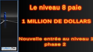 Le document présente une opportunité de marketing en ligne via un système de matrices où les participants peuvent gagner de l'argent en suivant un modèle de recrutement et de cycles. Il décrit les niveaux de gains potentiels associés à chaque phase d'entrée et les processus de paiement, tout en soulignant qu'il n'y a aucune garantie de revenus. Des avertissements sont également fournis concernant les variations potentielles des gains réels par individu.