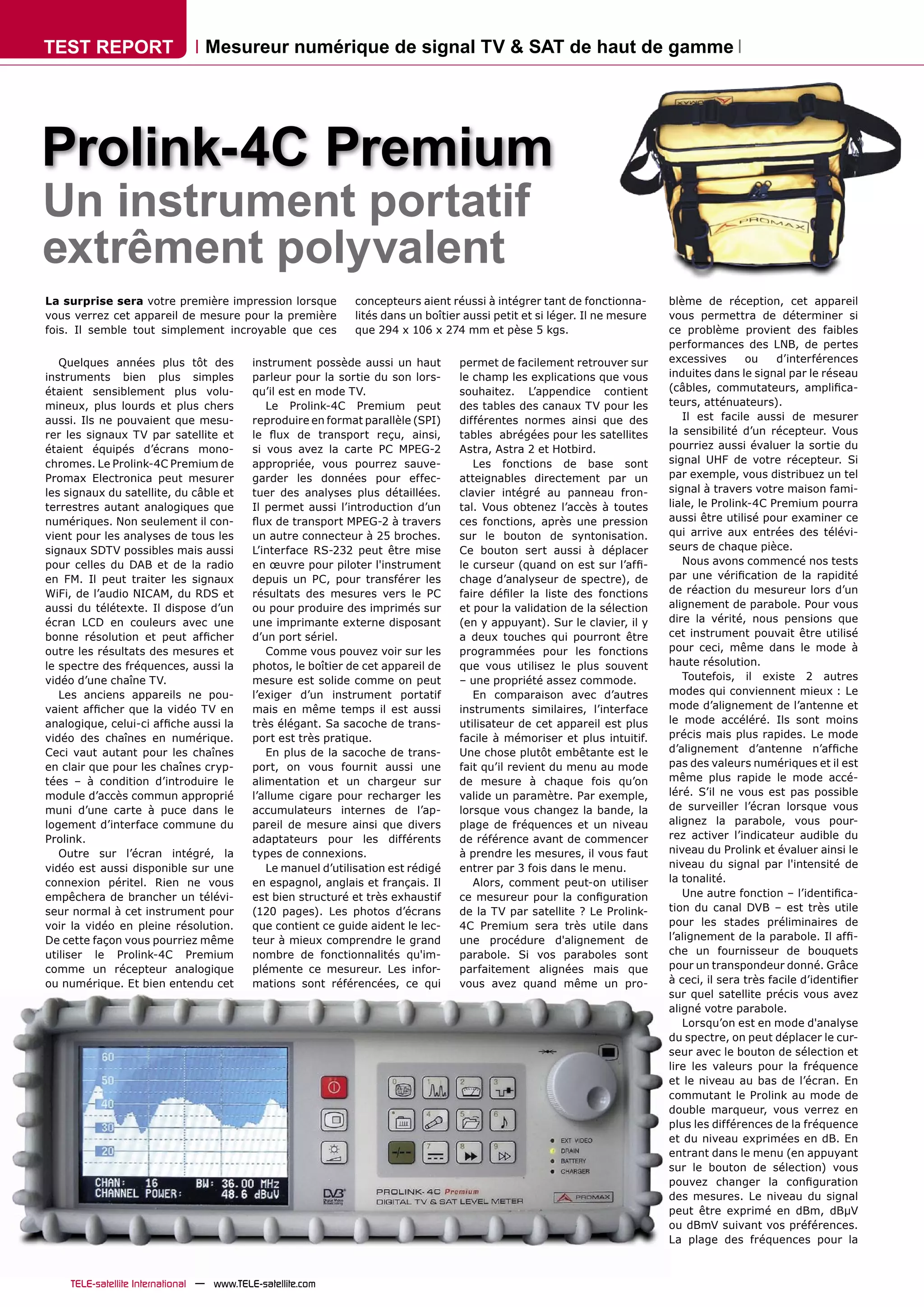 Le Prolink-4C Premium est un mesureur de signaux numériques de télévision et de satellite, compact et portable, capable d'analyser divers types de signaux avec une bonne précision. Cet appareil offre une multitude de fonctionnalités, y compris des mesures en mode TV, l'analyse du spectre et la capacité d'enregistrer des données pour des analyses ultérieures. Sa conception intuitive et son interface facile à utiliser en font un outil précieux pour les installateurs et les revendeurs d'équipements de télévision.