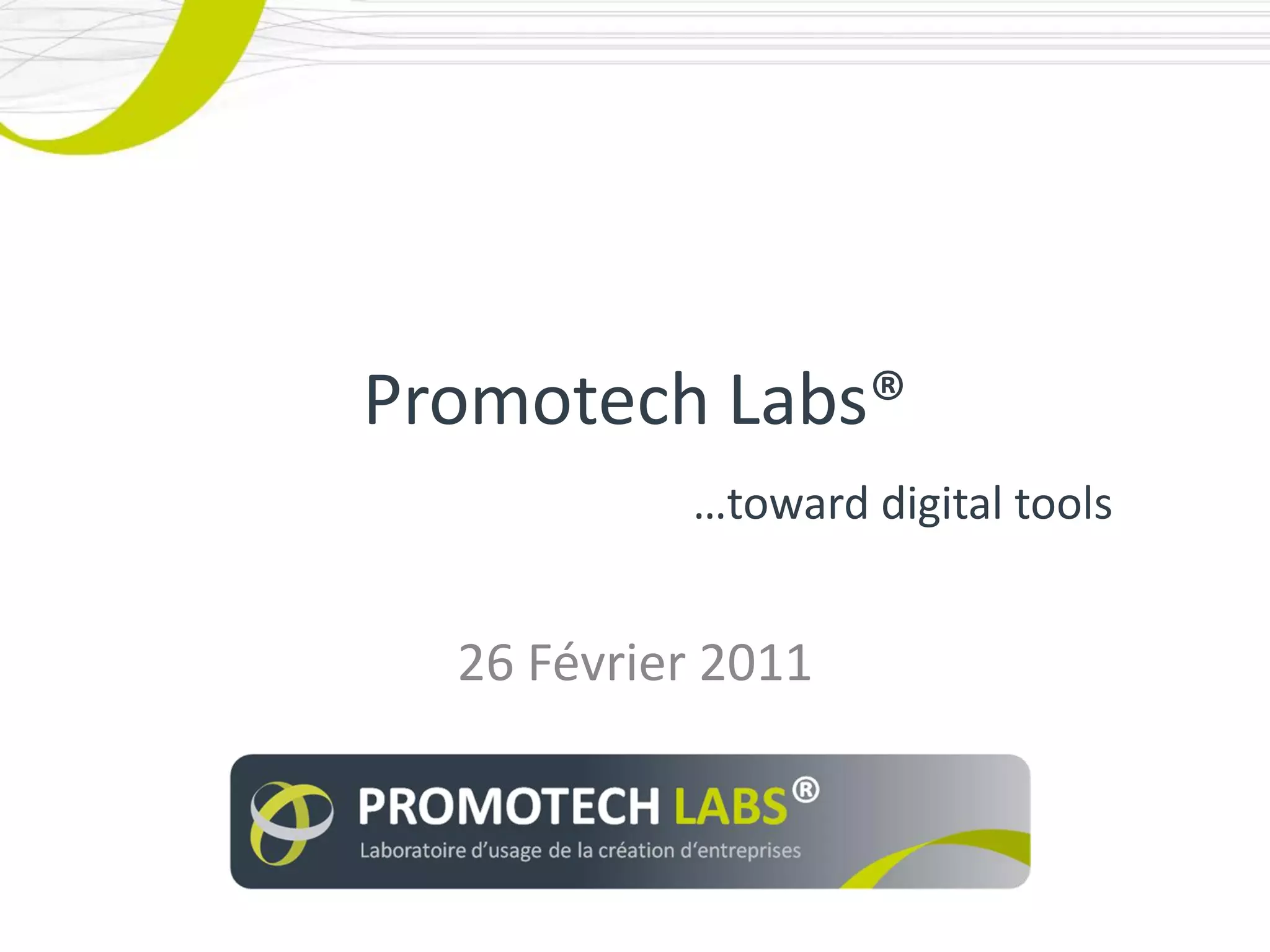 Le document présente promotech labs®, un centre d'innovation axé sur la création d'outils numériques et la collaboration utilisateur. Il détaille les méthodes de co-création, les projets en cours et les outils collaboratifs disponibles pour soutenir le processus de création d'entreprise. L'accent est mis sur l'approche centrée sur l'utilisateur et l'utilisation des technologies pour améliorer l'innovation et la productivité dans les projets d'entreprise.