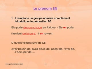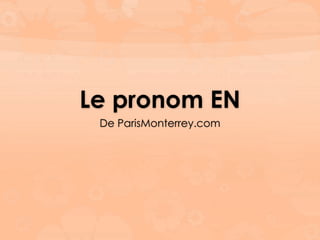 Le document présente les usages du pronom 'en' en français, notamment pour remplacer des groupes nominaux introduits par la préposition 'de' et pour exprimer des quantités. Il fournit également des règles concernant son emploi dans des phrases négatives et donne des exemples pratiques avec des exercices et leurs corrections. En résumé, 'en' est essentiel pour simplifier les phrases tout en maintenant le sens.