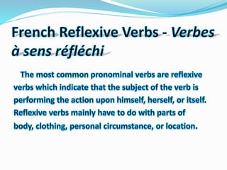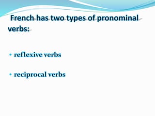 Les verbes pronominaux nécessitent un pronom réfléchi en plus d'un pronom sujet, indiquant que le sujet et l'objet de l'action sont les mêmes. Ils incluent des actions telles que se lever, se baigner, et se maquiller, tandis que les verbes réciproques montrent une interaction entre plusieurs sujets. Le document présente également des exemples et des exercices liés à ces verbes.