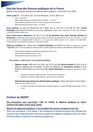 Le document présente une analyse des finances publiques françaises en 2015, soulignant un déficit important et un ratio élevé de dépenses publiques par rapport au PIB. Il propose 15 mesures pour améliorer l'efficacité de la sphère publique, notamment en optimisant l'allocation des ressources, en développant une culture de l'efficience et en instaurant de nouvelles méthodes de travail. Le but est de réduire les dépenses publiques tout en maintenant la qualité des services rendus aux citoyens.