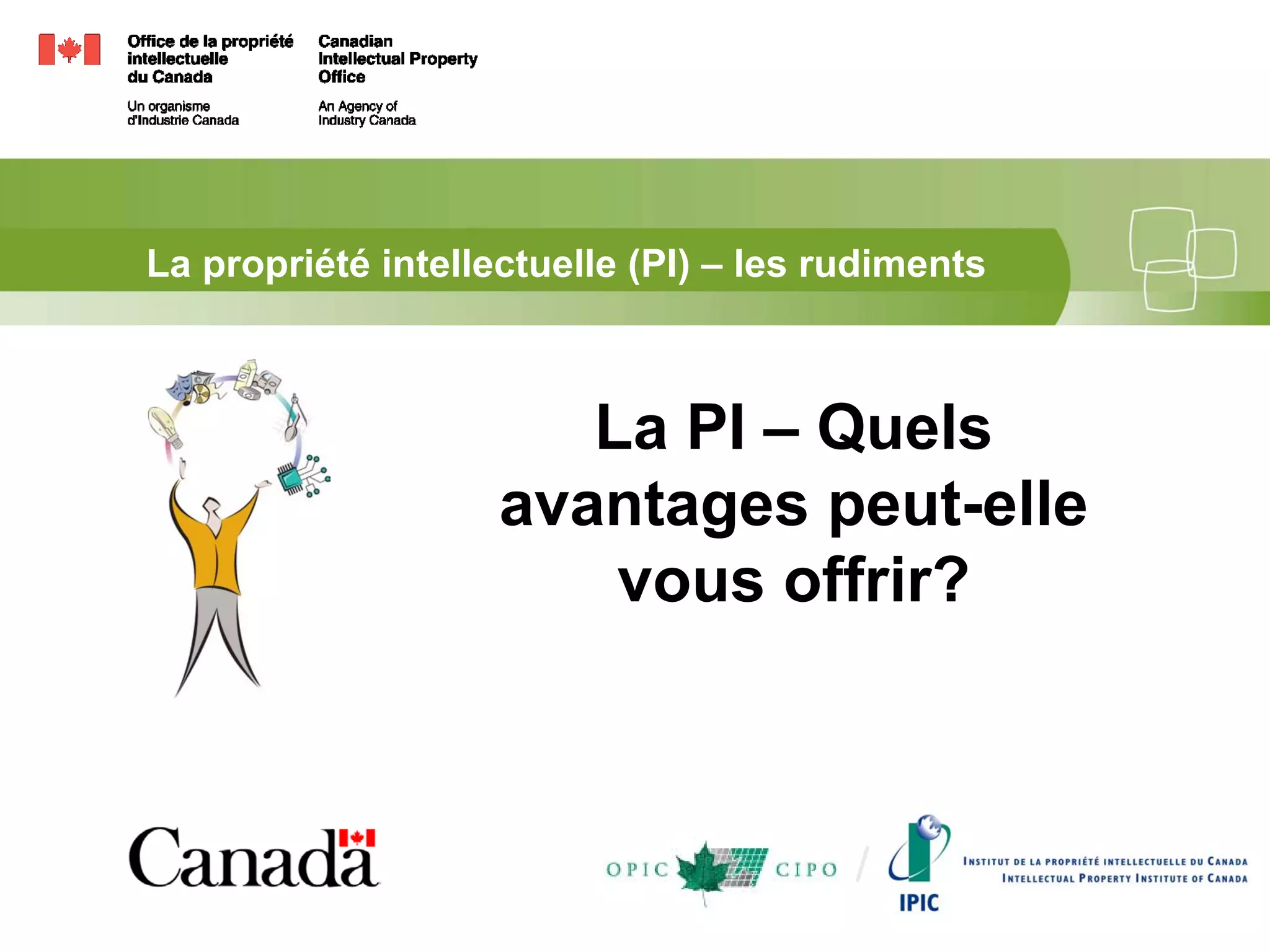 La propriété intellectuelle (PI) est un actif commercial stratégique qui offre divers avantages, notamment la protection des innovations et des créations. Les types de PI incluent les secrets industriels, brevets, marques de commerce, droits d'auteur et dessins industriels, chacun avec ses propres modalités de protection et de durée. Informer sur la PI peut aider à éviter des erreurs coûteuses et à maximiser la valeur des actifs de PI.