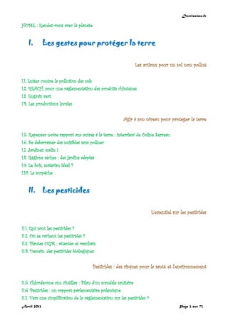 Le document présente des enjeux environnementaux critiques, notamment la pollution des sols, l'utilisation des pesticides et les catastrophes écologiques menaçantes. Il souligne l'importance d'adopter des actions concrètes pour préserver la terre, ainsi que l'impact de la réglementation REACH sur la gestion des produits chimiques. Un appel à la sensibilisation collective est formulé afin de protéger notre planète.