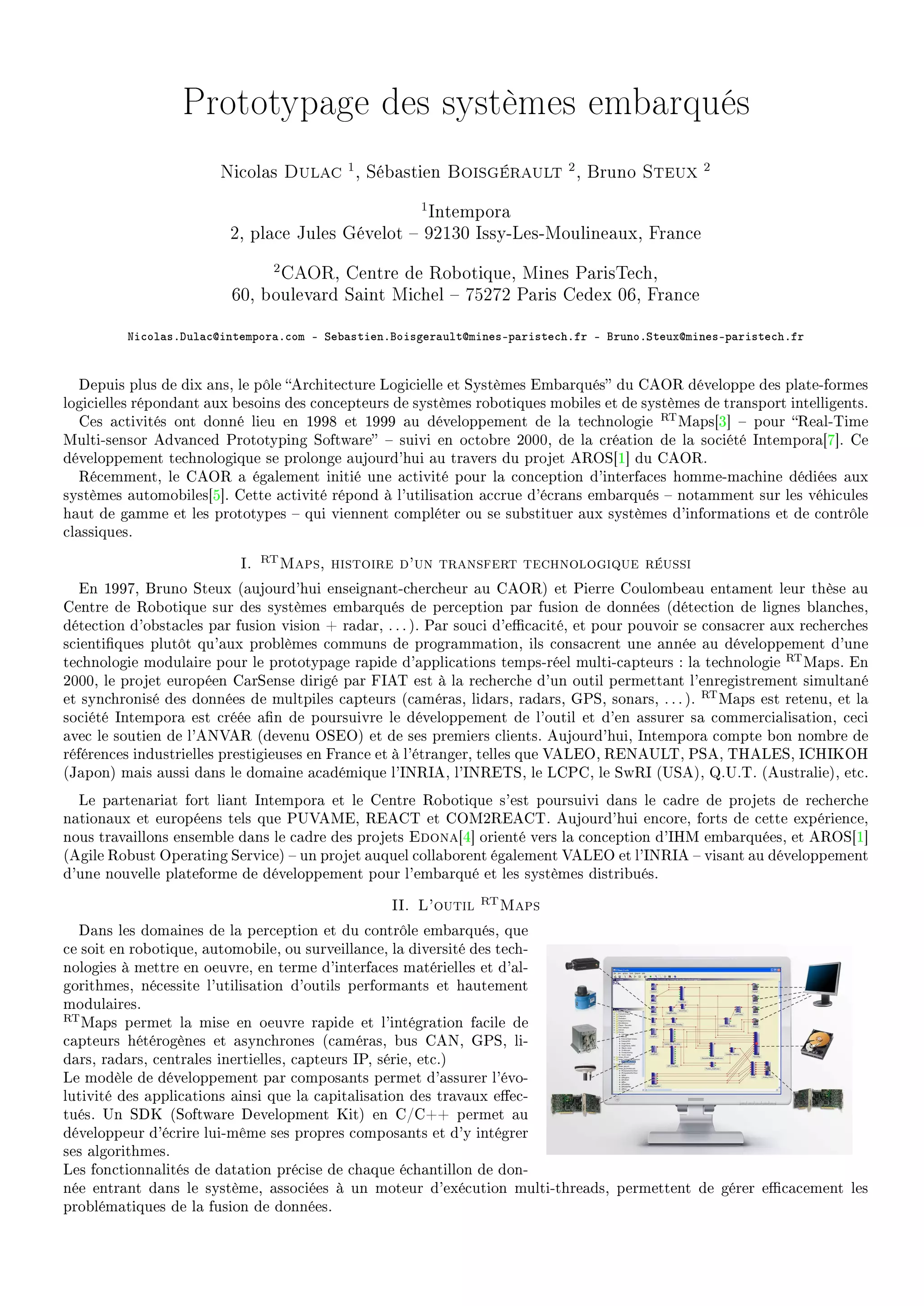 Le document présente le développement de technologies de prototypage pour systèmes embarqués, notamment la technologie RT Maps, créée pour faciliter l'intégration de capteurs dans des applications temps réel. Il traite également de la conception d'interfaces homme-machine pour systèmes de transport intelligents, soulignant l'importance de l'interopérabilité et du prototypage rapide. Les projets collaboratifs entre Intempora et le CAOR illustrent l'évolution et les applications de ces technologies dans les domaines de la robotique et de l'automobile.