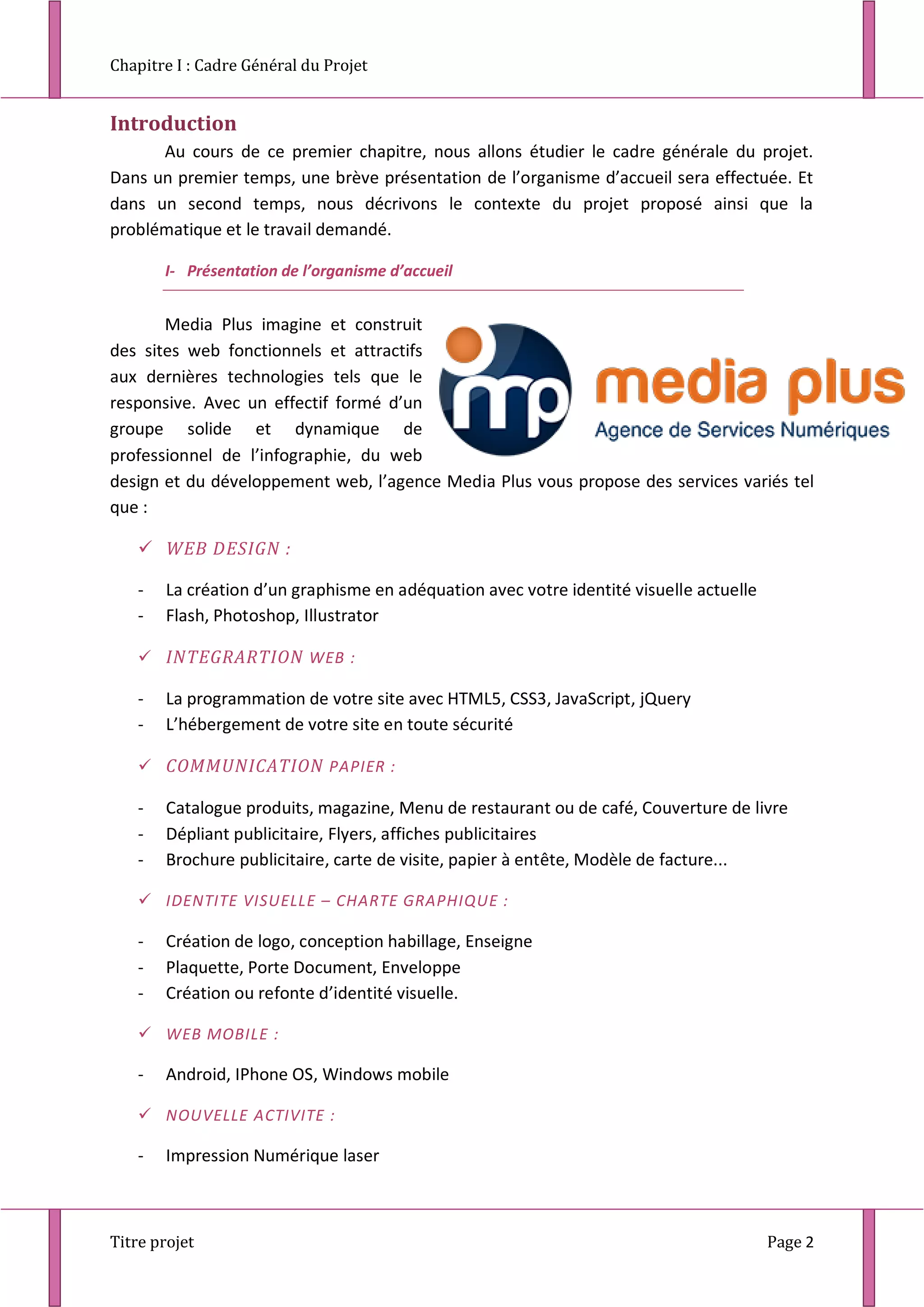 Le document présente le cadre général d'un projet de développement web au sein de l'agence Media Plus, qui se spécialise dans la création de sites internet. Il aborde l'analyse des besoins du projet, les fonctionnalités requises, ainsi que la méthodologie de développement adoptée. Le projet vise à intégrer des solutions informatiques adaptées aux exigences des utilisateurs, tout en considérant la qualité, la sécurité et l'ergonomie de l'application.