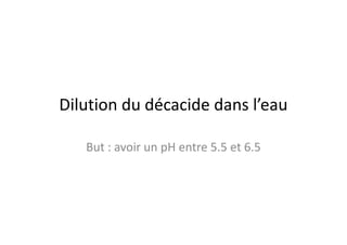 Le document traite de la dilution du décacide dans l'eau pour obtenir un pH entre 5.5 et 6.5 afin de résoudre des problèmes de calcaire et d'absorption de nutriments. Il fournit des instructions détaillées sur la préparation de la solution mère et la quantité de décacide à utiliser selon le volume d'eau de la solution fille. Des précautions de sécurité sont également mentionnées concernant l'utilisation de ce produit phytosanitaire.