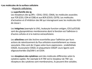 Le document traite des molécules de signalisation dans la réaction immunitaire, illustrant les rôles des récepteurs, intégrines, sélectines et cytokines dans la captation et la transduction du signal. Il souligne l'importance des motifs ITAM et ITIM dans l'activation et l'inhibition des cellules immunitaires. Enfin, il décrit les interactions entre différentes molécules de surface et leurs ligands, ainsi que la spécificité de ces interactions.