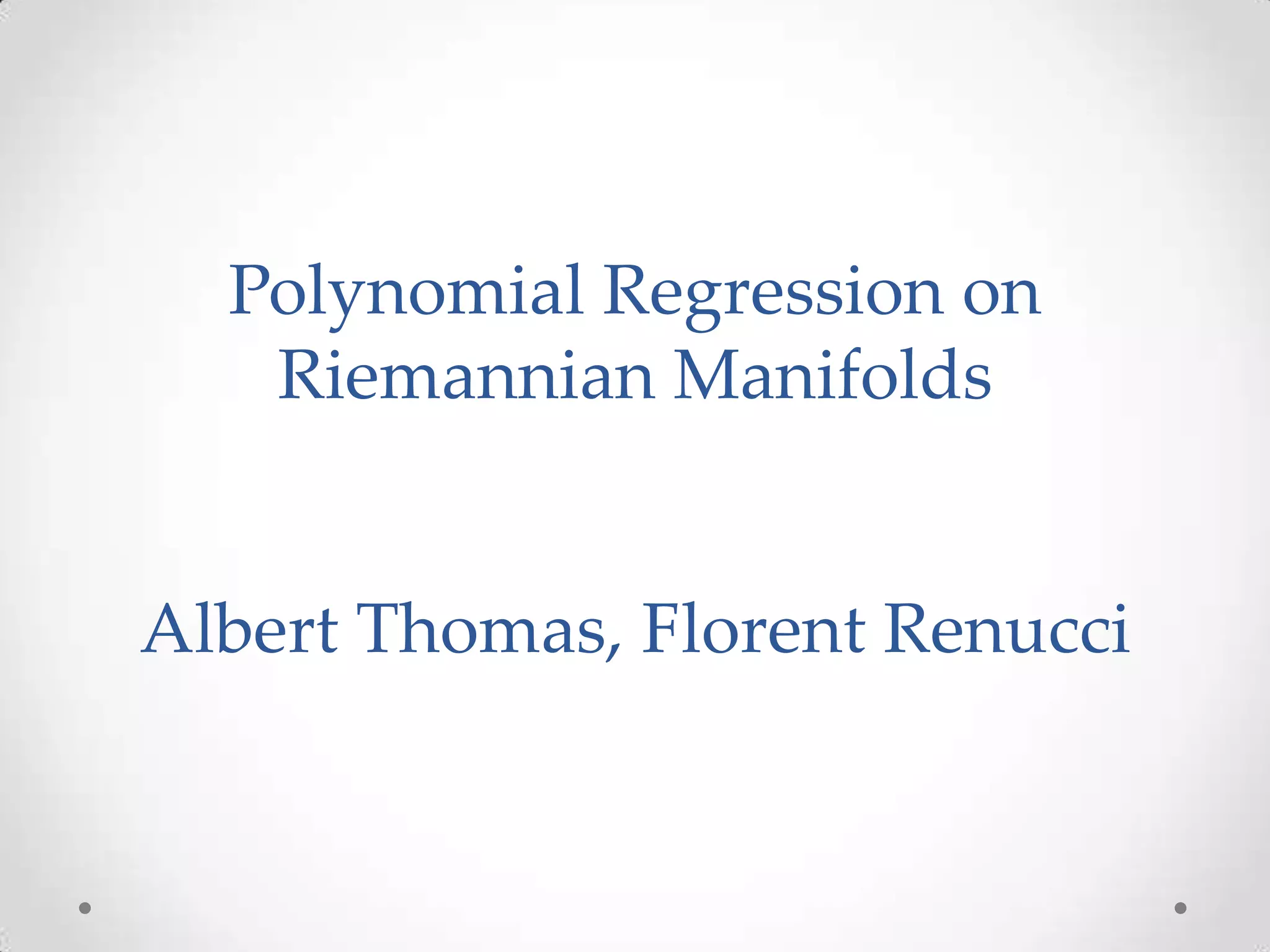Ce document présente une méthode d'adaptation de la régression polynomiale paramétrique aux variétés riemanniennes, en établissant des liens entre les variables explicatives et la variable à estimer. Il aborde la définition des polynômes, l'intégration par la méthode d'Euler, ainsi que les résultats de l'algorithme appliqué à la sphère et une application à l'évolution d'un crâne de rat. Les conclusions soulignent à la fois les avantages de cette approche et les défis concernant le choix du degré du polynôme et le pas d'intégration.