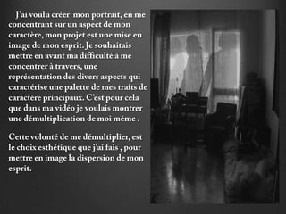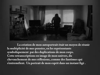 Le document traite des différents 'moi' présents dans l'image, où chaque personnage accomplit une action symbolique pour aider le personnage central à créer. Ces personnages, semblables à des fantômes, évoluent dans des espaces et temporalités variés, soulignant l'idée d'une présence absente. Des références artistiques, telles que celles de Thierry Kuntzel et René Magritte, sont citées pour étayer cette notion.