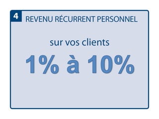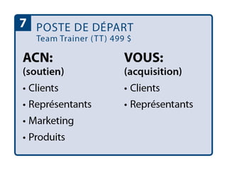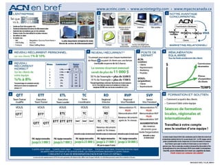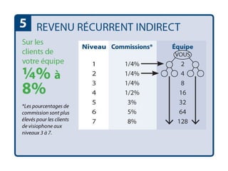 Le document décrit les différentes commissions et primes d'acquisition pour les membres de l'équipe, y compris des plafonds mensuels de revenus récurrents qui varient selon les niveaux hiérarchiques. Il mentionne également l'admissibilité au séjour de retraite annuel pour différents postes, tels que vice-président régional et directeur régional. Des détails sont fournis sur les rémunérations et les augmentations possibles des revenus pour l'organisation.