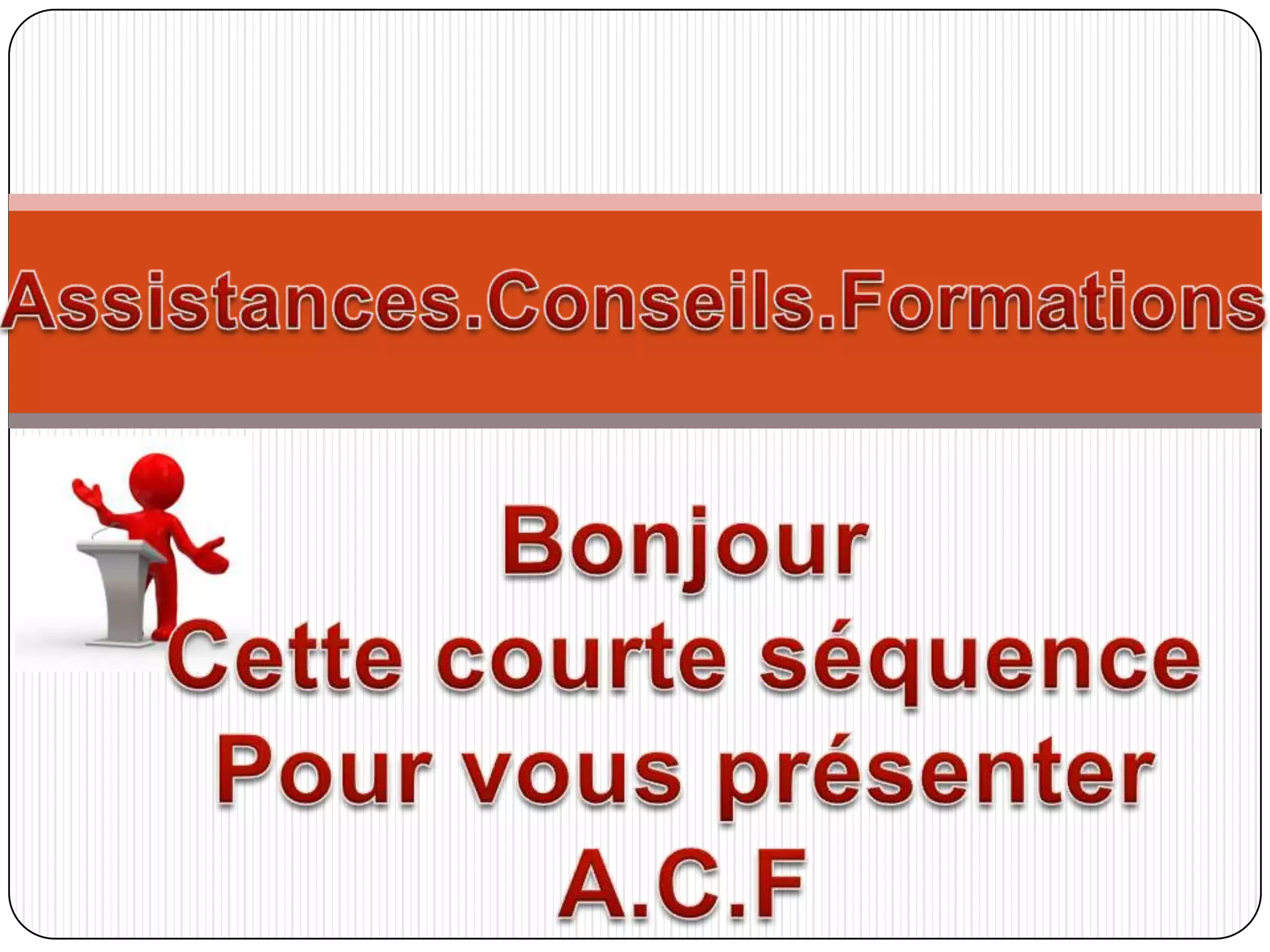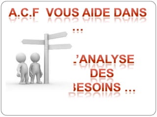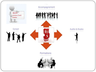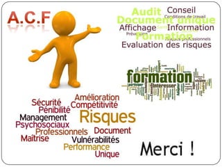 Le document présente la société a.c.f, spécialisée dans l'assistance, le conseil et la formation en prévention des risques professionnels et des accidents du travail. Elle offre des services variés tels que des audits, des conseils réglementaires et des formations sur des thématiques de sécurité variées. Les intervenants de a.c.f sont des professionnels expérimentés dans le domaine, engagés à aider les entreprises à améliorer leur sécurité au travail.